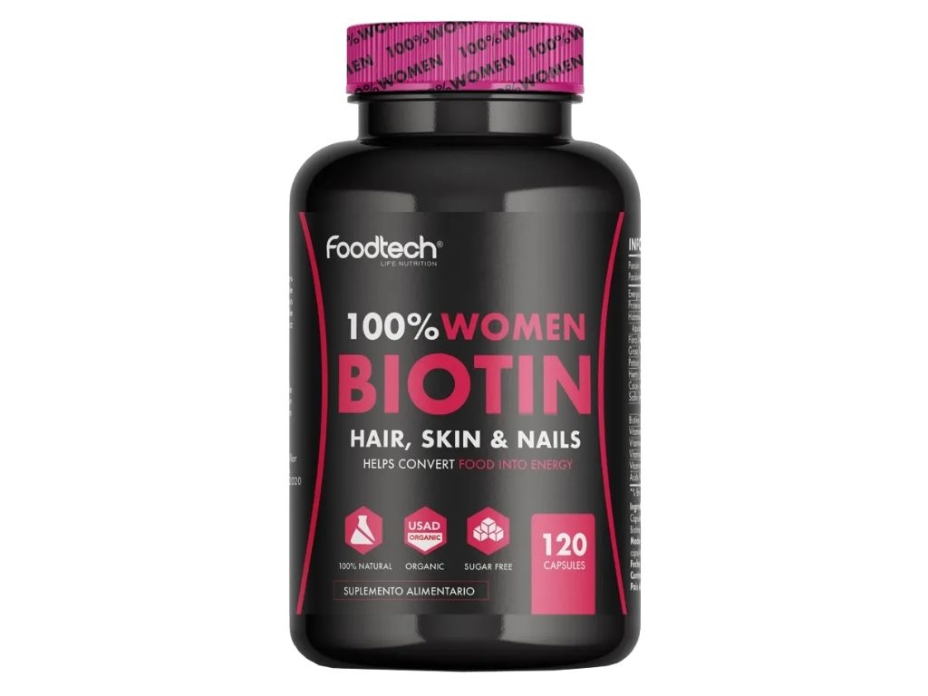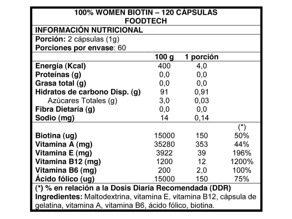 100% Women Biotin de Foodtech es un suplemento alimentario de biotina, el cual también contiene vitamina A, E, B12, B6 y ácido fólico. La 100% Women Biotin tiene una fórmula concentrada de biotina que entrega el aporte perfecto cuando no se logra cubrir a través de la alimentación. Son cápsulas orgánicas y libres de azúcares