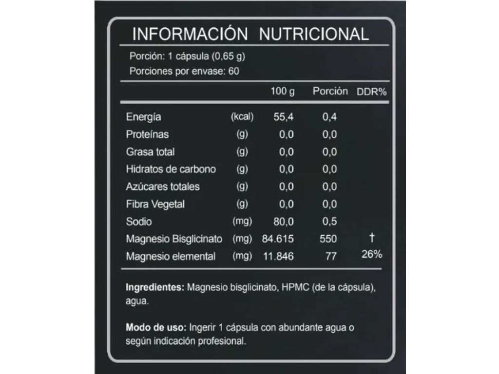 Magnesio Bisglicinato; HPMC (de la cápsula), Agua.