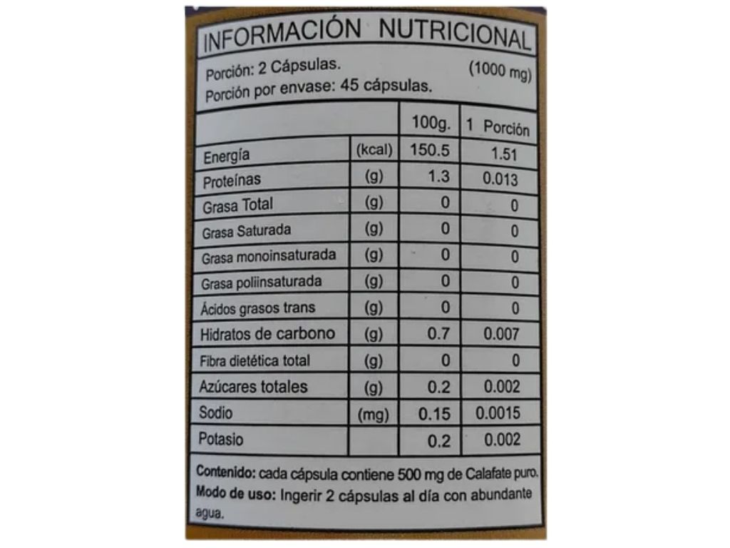 El calafate tene un alto contenido de polifenoles y flavonoides por lo que es considerado un excelente antioxidante natural que protege al organismo del envejecimiento celular. Su valor ORAC es superior al maqui y a múltiples variedades de berries. Alto contenido de vitaminas C y E las que aportan diversos beneficios a la salud y aspecto de la piel (luminosidad, arrugas, flacidez), fortalecimiento de las uñas y el cabello, mejoras en la regulación hormonal, refuerzo del sistema inmunológico y prevención de patologías degenerativas.