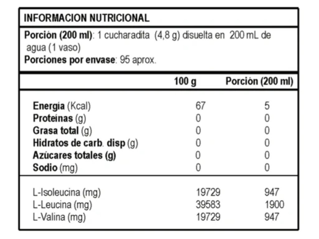 L-leucina, L-valina, L-isoleucina, ácido cítrico, almidón de maíz, sabor natural y artificial, sucralosa, acesulfamo de potasio, rojo 40