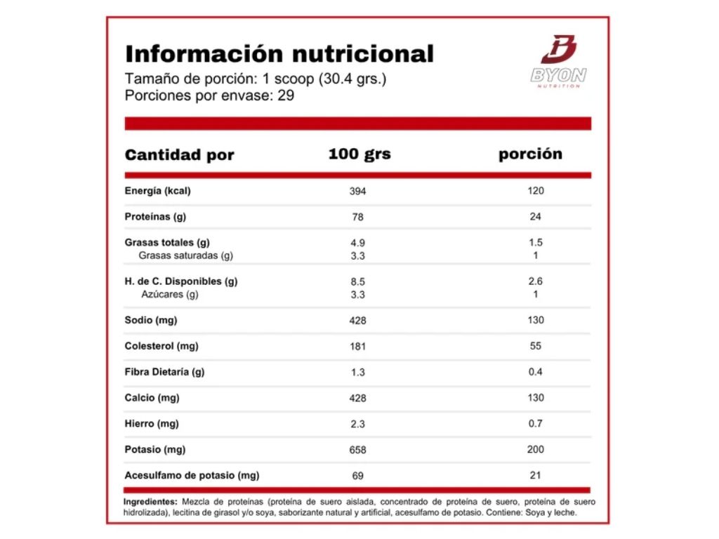 Proteína de suero de leche (aislado de proteína de suero, concentrado de proteína de suero, péptidos de suero). Sabores naturales y artificiales. Lecitina de soya. Sucralosa