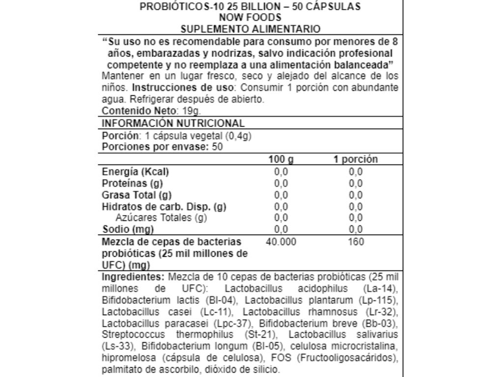 Probiótico Probiotic-10, 25 Billones, 50 cápsulas Vvegetales, marca Now. 25 Billones. Probiotic-10 contiene una mezcla de 10 Cepas certificadas.