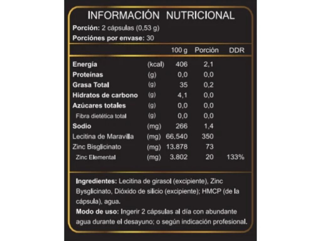 Bisglicinato de Zinc: Forma orgánica de zinc con excelente absorción y tolerancia digestiva. Lecitina de Girasol: Aporta fosfolípidos que estabilizan la fórmula. Excipientes: Dióxido de Silicio.
