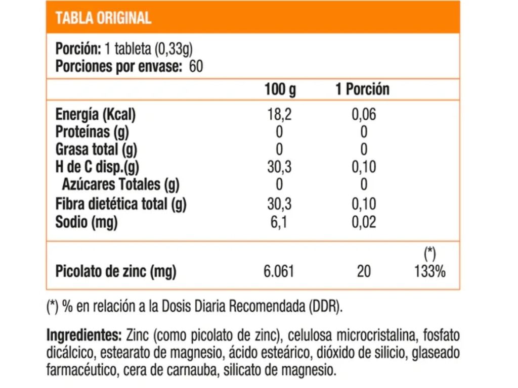 Zinc (como picolato de zinc), celulosa microcristalina, fosfato dicálcico, estearato de magnesio, ácido esteárico, dióxido de silicio, glaseado farmacéutico, cera de carnauba, silicato de magnesio.